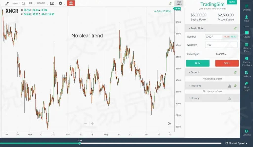 Czy dostrzegasz brak trendu na powyższym wykresie? To właśnie nazywamy rynkiem w przedziale, czyli papierami wartościowymi, które nie mają wyraźnego trendu. Większość tych akcji jest notowana w przedziale.