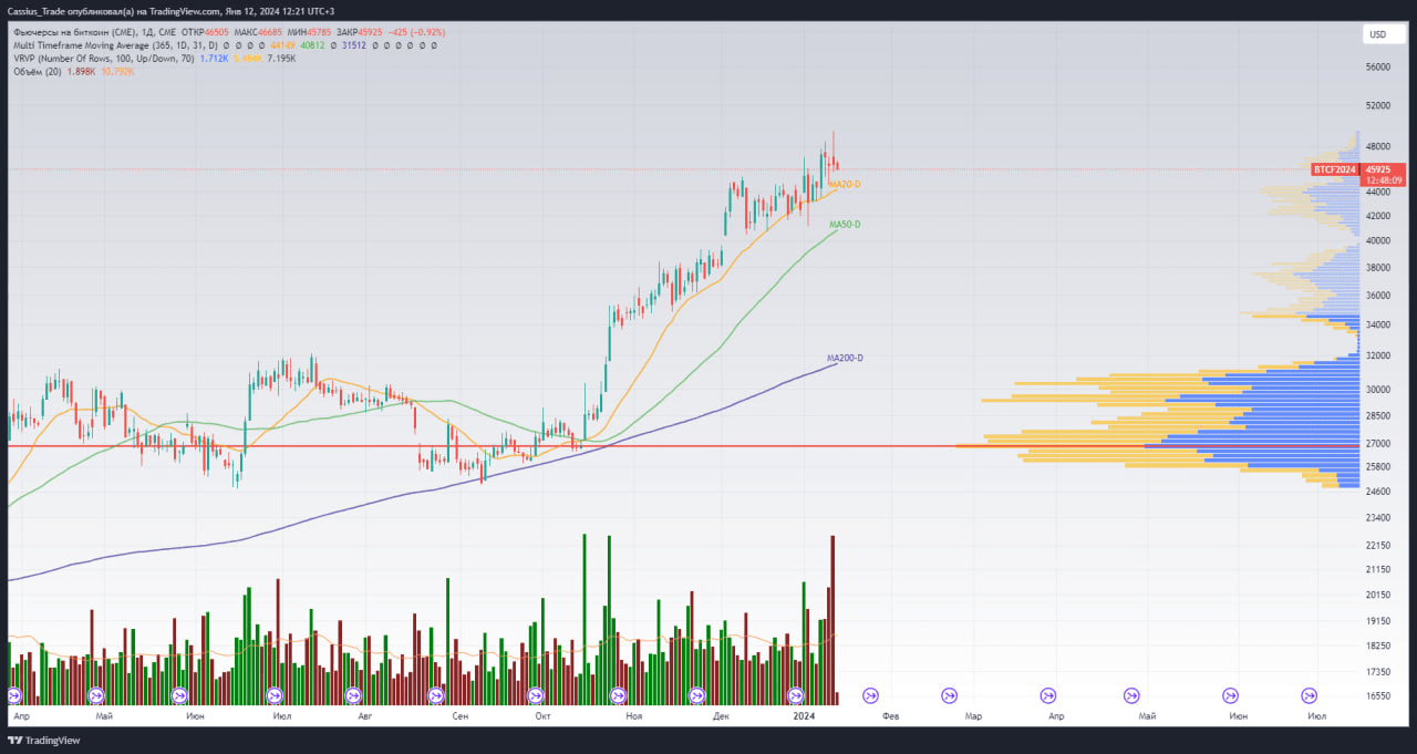 W tej chwili ta średnia krocząca oscyluje w okolicach 44 000 dolarów i spadek poniżej tej strefy wywoła efekt domina z likwidacją długich pozycji z ramionami.