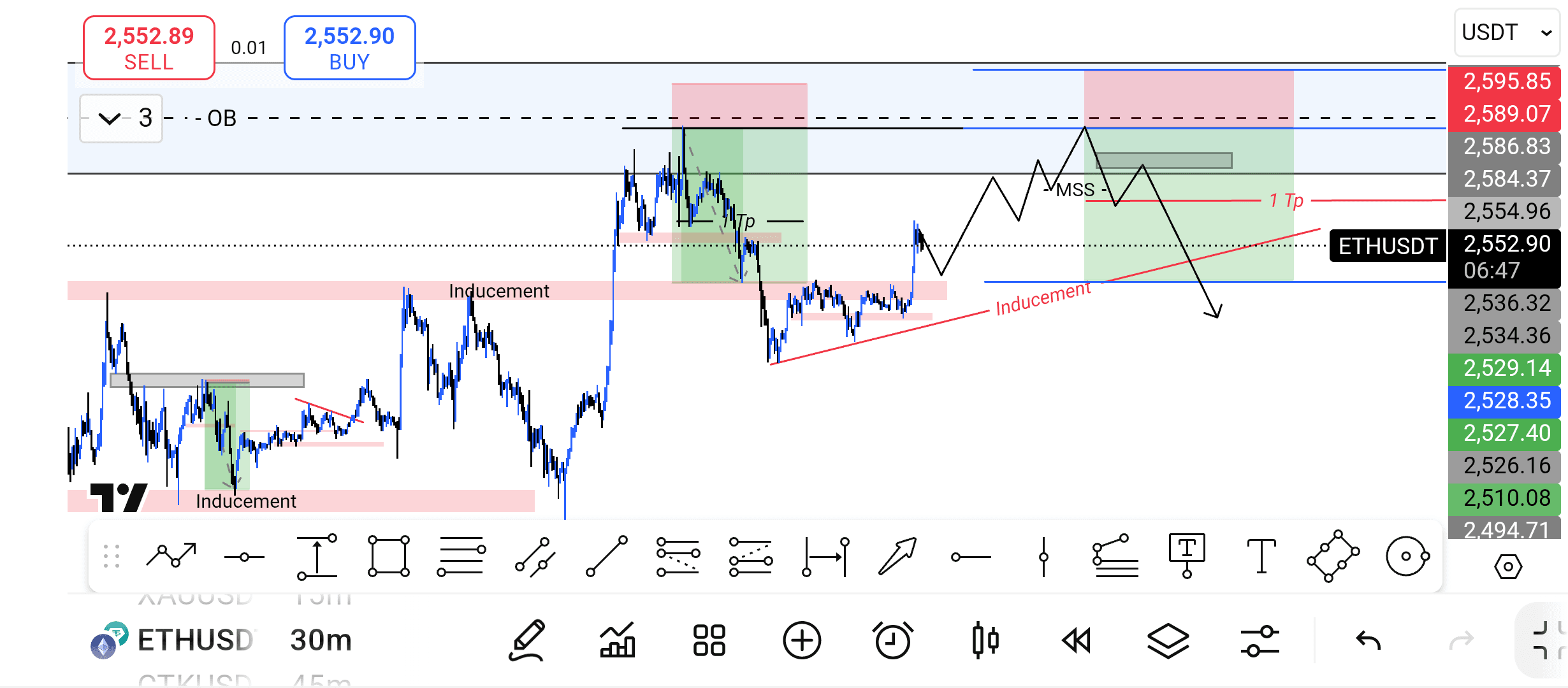 "To jest transakcja Ethereum, a jak widzisz, rynek również wcześniej się tutaj zapełniał. Zrealizowałem sprzedaż z tego samego poziomu i była to zyskowna transakcja. Dziś cena znowu jest na tym samym poziomie. Na tym poziomie, jeśli podejmujesz transakcję z stosunkiem ryzyka do zysku 1:1, powinieneś zarezerwować swój zysk i przesunąć swój stop-loss na poziom break-even (50%), aby zabezpieczyć swoją pozycję."