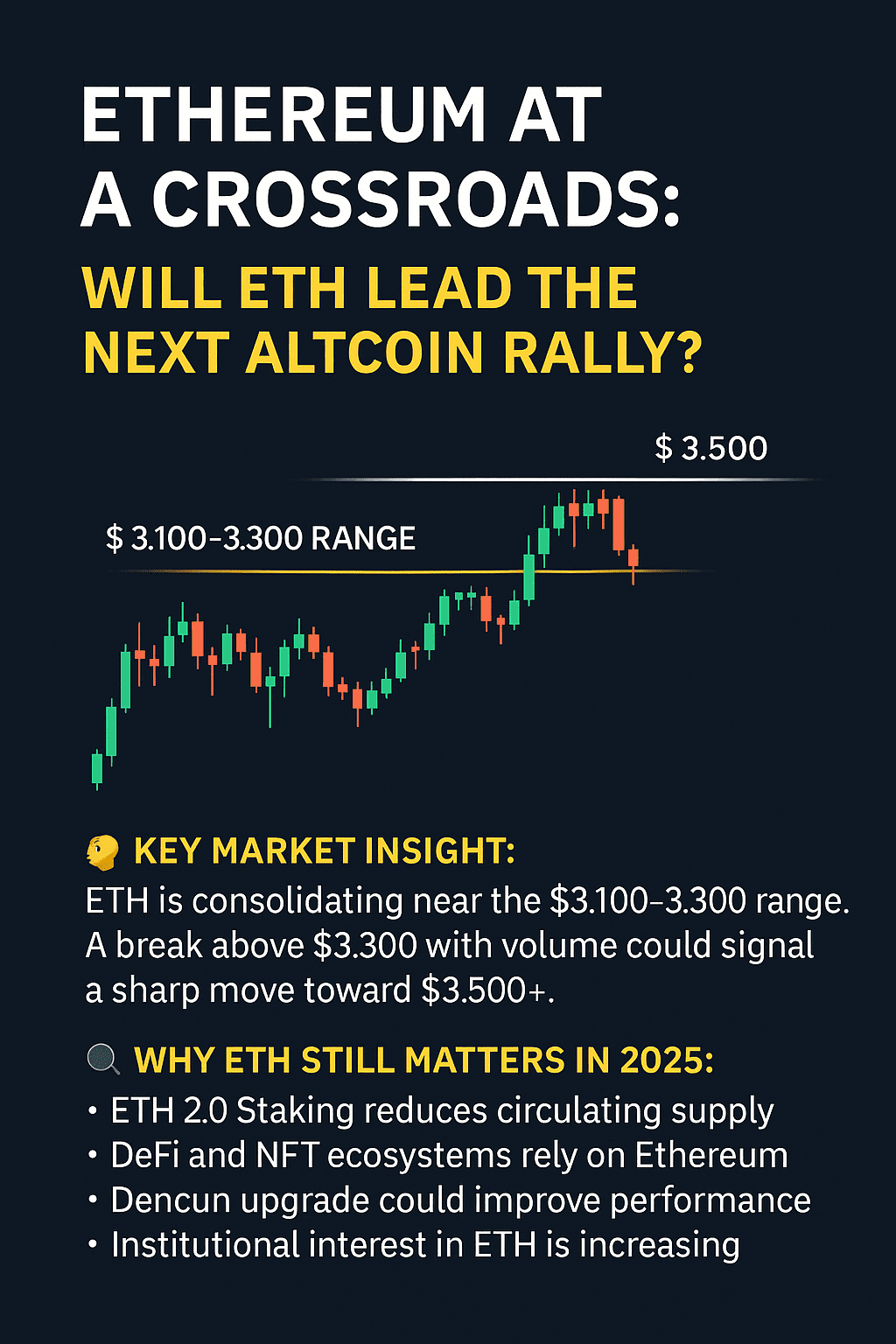 ETH konsoliduje się w okolicach zakresu $3,100–$3,300. Ta strefa historycznie działała zarówno jako wsparcie, jak i opór. Jeśli Ethereum przebije powyżej $3,300 przy wolumenie, możemy zobaczyć szybki ruch w kierunku $3,500+.