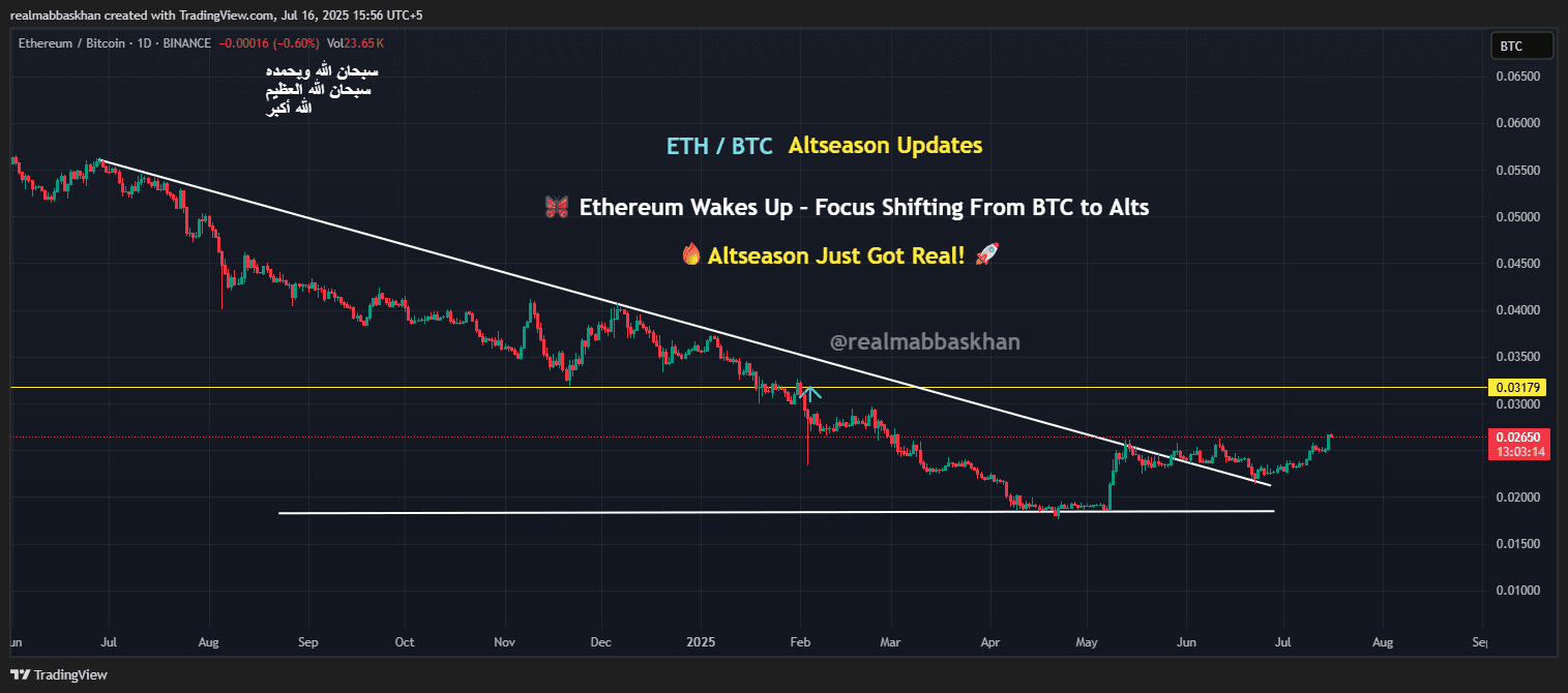 🦋 Aktualizacja ETH/BTC – Czy znowu czujemy sezon altów? Ethereum w końcu przebiło się powyżej bariery 0.026₿ — która dosłownie trzymała ETH przez cały rok 😮💨🦋 Ethereum się budzi – Skupienie przesuwa się z BTC na alty..🧠 Mądre pieniądze rotują w kierunku altów!