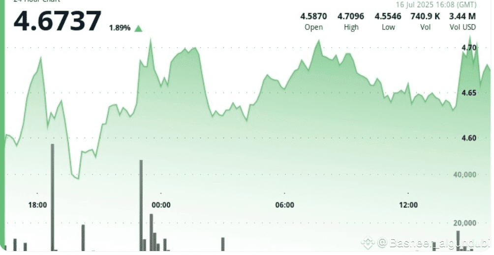 Wzrost o 1% na godzinę przedłuża 24-godzinną falę wzrostową, przy utrzymaniu ceny powyżej poziomu wsparcia 4,66 USD, co sugeruje trwałą akumulację instytucjonalną.