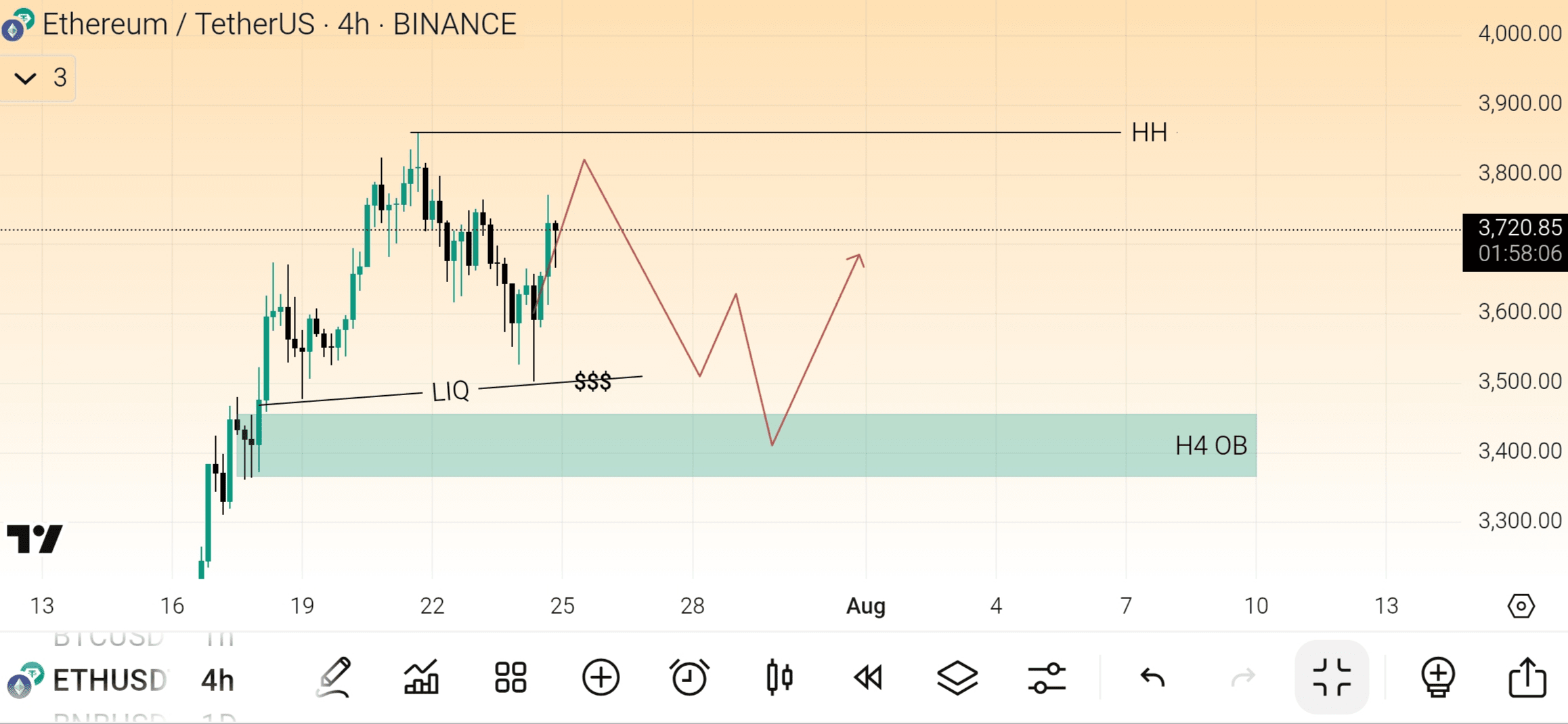 2- Jeśli Ethereum znajdzie się w H4 OrderBlock, to również weźmie dzienną płynność, która jest również bardzo wysoka.