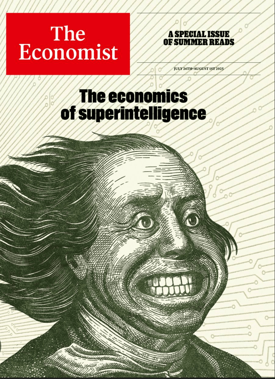26 lipca 2025 roku The Economist opublikował przerażającą i satyryczną okładkę zatytułowaną „Ekonomia superinteligencji.” Obrazek przedstawia to, co wygląda jak ludzka twarz — wyrzeźbiona jak waluta — z zniekształconym, sztucznym uśmiechem. Tło? Sieć cyfrowych obwodów, sygnalizująca erę inteligentnych maszyn i transformacji gospodarczej.