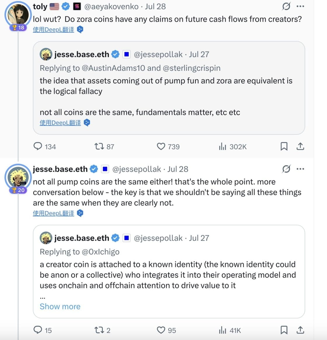 Z kolei Jesse Pollak twierdzi, że tokeny twórców na Zora mają unikalną wartość, co równa się logice pomyłki, a Anatoly Yakovenko stwierdza, że te tokeny to tylko produkty wirusowe, a nabywcy chcą po prostu sprzedać je, gdy są gorące. Pollak odpowiada, że tokeny to potężna technologia umożliwiająca przepływ wartości twórców, a ci, którzy się nie zgadzają, mogą trzymać się poglądu, że „treść nie ma wartości”.