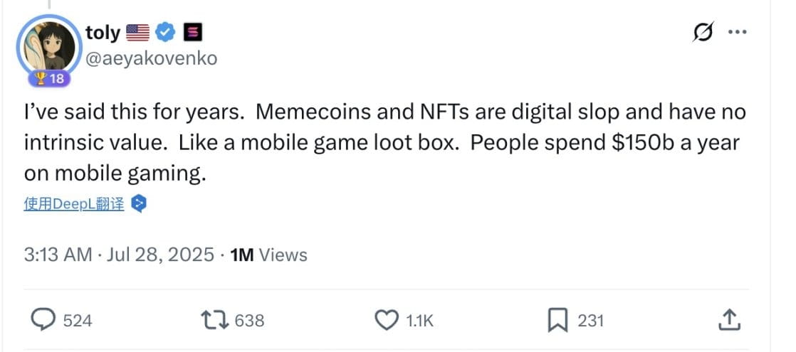 W trakcie dyskusji Anatoly Yakovenko wyraził swoje zdanie: „Memecoiny i NFT to cyfrowe śmieci, nie mają wewnętrznej wartości”, porównując te aktywa cyfrowe do mechanizmu „otwierania paczek” w grach free-to-play.