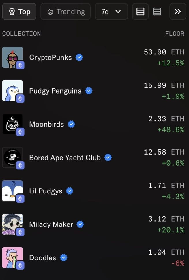 Pozostałe NFT blue chip na ETH również wzrosły w ciągu tygodnia, cena minimalna Moonbirds przekroczyła 2 ETH, wzrastając o prawie 50%, a cena minimalna Milady Maker przekroczyła 3 ETH, wzrastając o ponad 20%.