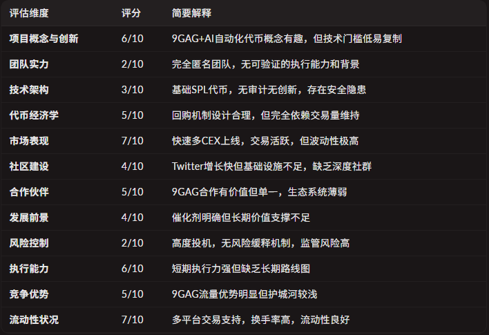 Podstawowa wartość technologiczna: poprzez silnik AI Moonit, popularne treści 9GAG są na bieżąco przekształcane w tokeny do handlu, co stanowi innowacyjne podejście do "treści jako tokenów". Przyjęcie standardu SPL tokenów z 0% podatkiem od transakcji oraz możliwością cofnięcia uprawnień zamrożenia.