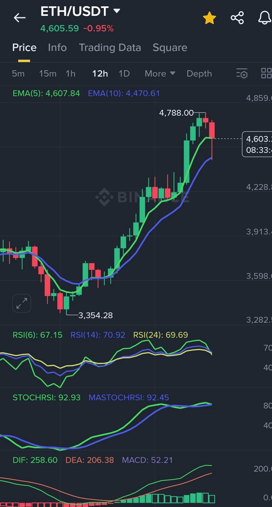 EMA(5) na poziomie 4 607 USD jest nadal powyżej EMA(10) na poziomie 4 470 USD, potwierdzając wzrostowy trend.