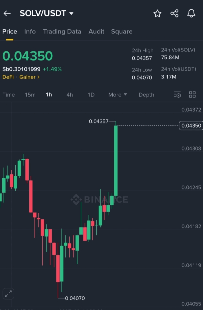 SOLV wzrósł z poziomu wsparcia 0.04070 i teraz handluje po 0.04350, co pokazuje silny trend wzrostowy. Przełamanie na poziomie 0.04357 wskazuje na wyraźną zmianę kierunku, z dominacją kupujących. Jeśli wolumen pozostanie silny, kolejny potencjalny cel wzrostu może wynosić 0.04420 i więcej.