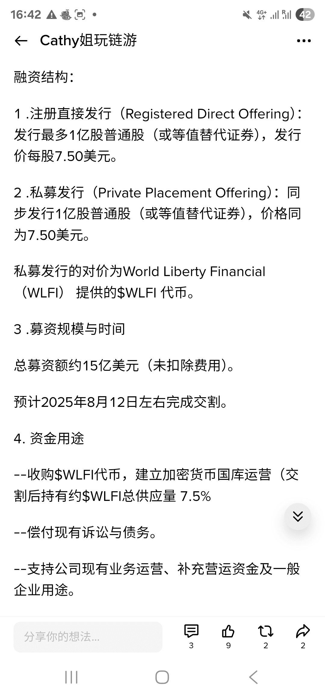 Ponadto, z 1,5 miliarda dolarów ogłoszonego przez ALT5, 750 milionów dolarów zwykłych akcji ma być publicznie oferowanych; w porównaniu do danych dotyczących całkowitej liczby akcji firmy ALT5 z 12 i 20 sierpnia, ta publiczna oferta 100 milionów akcji powinna rozpocząć się po handlu tokenem $WLFI, a wtedy akcje i tokeny mogą się ze sobą łączyć. W przeciwnym razie, w braku pozytywnych informacji, bezpośrednie zwiększenie o 100 milionów akcji może spowodować, że cena akcji spadnie o połowę.