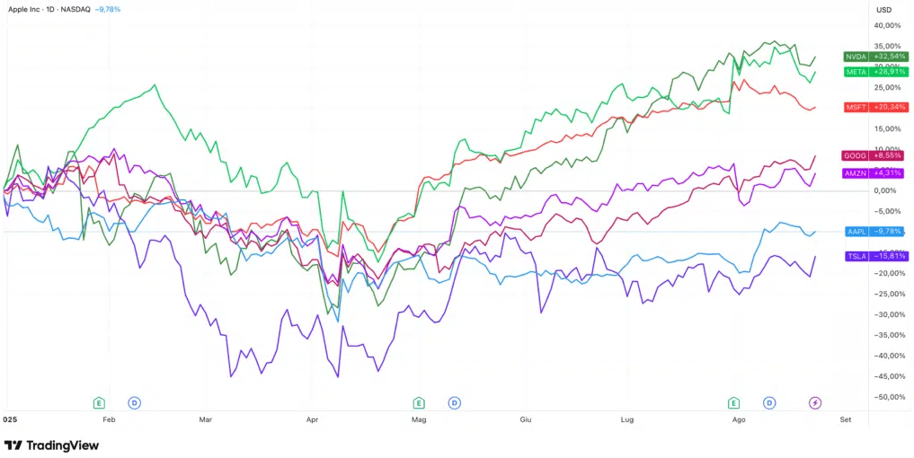 Kapitalizacja Magnificent Seven ma ogromny wpływ na S&P 500. W sierpniu 2025 roku dane pokazują, że: