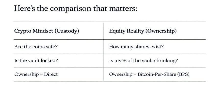 Większość inwestorów myśli jak posiadacze kryptowalut (bezpośrednia własność = bezpieczeństwo), ale w przypadku akcji liczy się liczba satoshi na akcję (satoshi na akcję lub BTC-na-akcję)