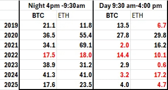 Nocne zwroty Bitcoina: +48 punktów bazowych średnio.