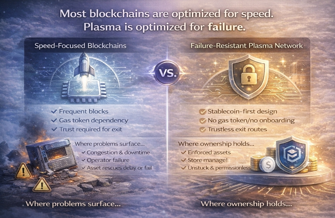 Plasma doesn’t appear to be designed for perfect conditions. It’s designed for failure. That sounds pessimistic, but in payments and settlement infrastructure, it’s actually the most honest starting point. Operators go offline. Validators fail. Networks experience congestion. Users make mistakes. The question isn’t whether these things happen, it’s whether the system still protects ownership when they do.