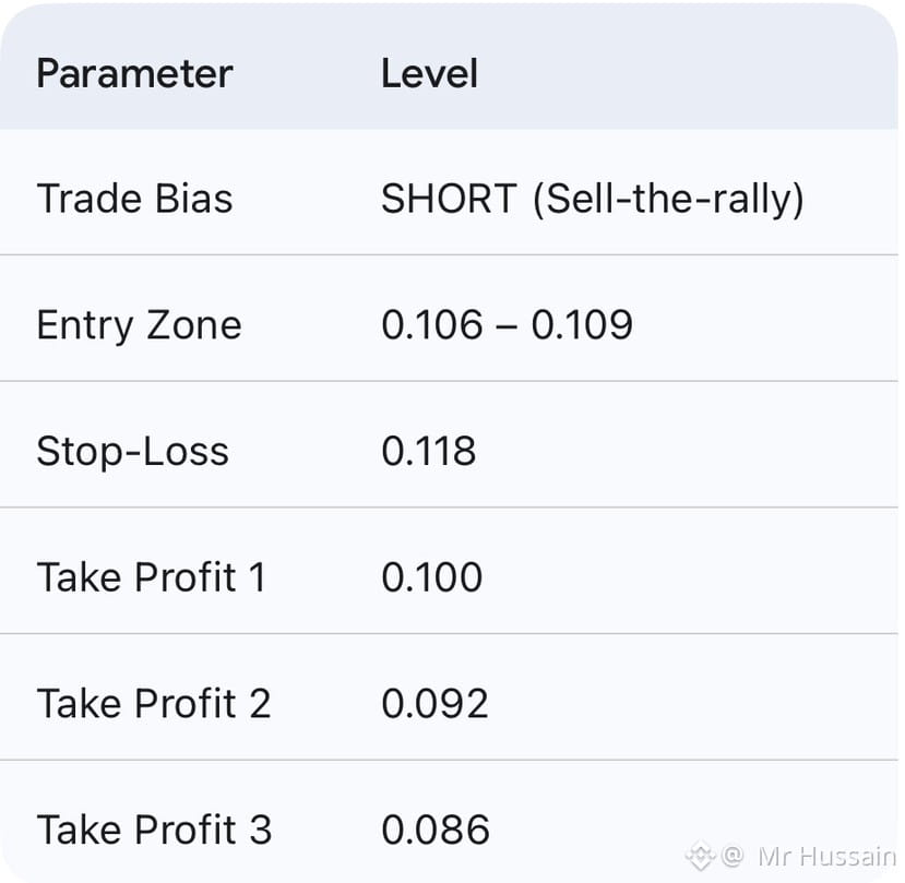 As long as 0.118 holds as resistance, the path of least resistance is down. A clean break and daily close above that level invalidates this setup and shifts us back to neutral. Play it smart and manage your risk.