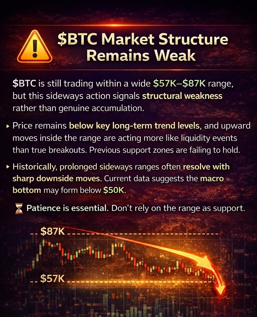 $BTC BTC is still trading within a wide $57K–$87K range, but this sideways action signals structural weakness rather than genuine accumulation.Price remains below key long-term trend levels, and upward moves within the range are acting more like liquidity events than true breakouts. Previous support zones are failing to hold.Historically, prolonged sideways ranges often resolve with sharp downside moves. Current data suggests the macro bottom may form below $50K