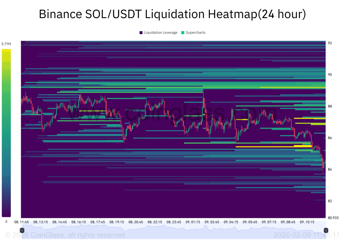 W tej chwili SOL handluje poniżej tego klastra (~$83.89).