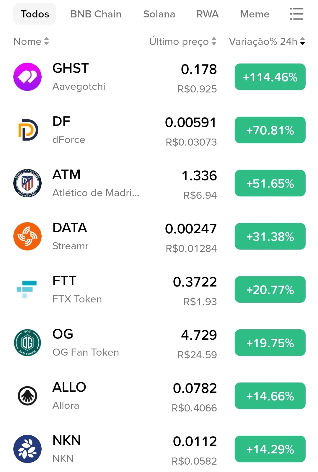 该图表展示了一组在 24 小时内表现异常强劲的加密货币。GHST(Aavegotchi)表现最为突出,涨幅高达 +114.46%,其次是 DF(dForce),上涨 +70.81%,以及 ATM(马德里竞技球迷代币),上涨 +51.65%。所有列出的资产均处于上涨状态,涨幅区间从 +14.29% 到 +114.46% 不等,涵盖了 Gaming(如 GHST)、现实世界资产(RWA,如 ATM)以及实用型代币(DATA、FTT)等类别。