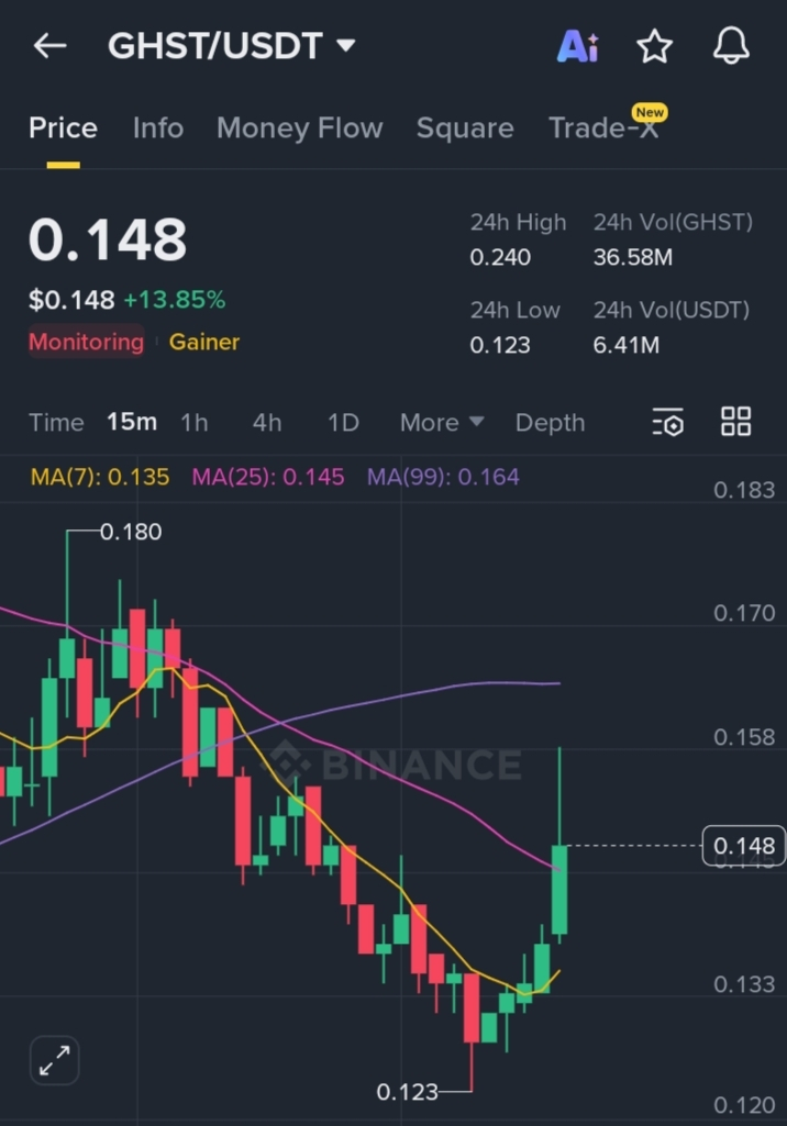 After the drop, GHST printed a clean rebound from $0.123, triggering aggressive buying interest. The move was sharp enough to push price back above the short-term moving averages, confirming a bullish reversal attempt rather than just a small bounce. This is often the first step in a trend shift when a coin has been oversold.