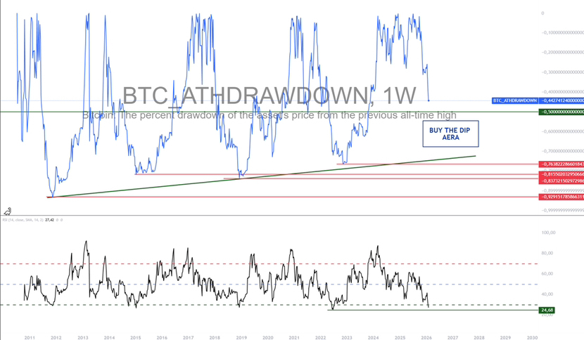 Zastosowane do Bitcoina, DCA jest najskuteczniejsze podczas zaawansowanych faz spadku, gdy panuje pesymizm, a długoterminowe wskaźniki weszły w obszar wyprzedania. Historycznie obszary 50% do 70% spadku od poprzedniego szczytu często były bardzo korzystnymi strefami akumulacji dla cierpliwych inwestorów.