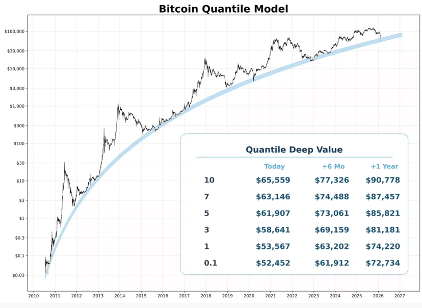 Nie ma dowodów sugerujących, że ubiegłotygodniowe minimum wynoszące $60,000 jest ostatecznym dnem rynku niedźwiedzia, a całkowicie możliwe jest, że ten poziom zostanie ponownie odwiedzony w nadchodzących miesiącach. Jednak większość modeli prognozowania BTC na długą metę, takich jak model kwantylowy oparty na prawie potęgowym, opisuje strefę $50,000/$60,000 jako obszar, w którym strategia uśredniania kosztów dolara (DCA) ma wysokie prawdopodobieństwo sukcesu w dłuższej perspektywie.
