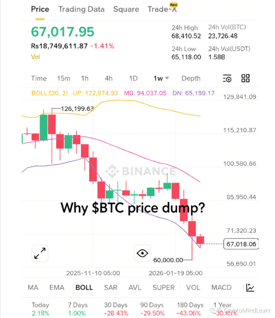 Another major reason behind the dump is a liquidity reset. Bitcoin had been trading at elevated levels for an extended period, and buying strength started weakening. During this phase, smart money typically distributes positions quietly while retail traders remain bullish. When support breaks, price moves fast due to thin buy-side liquidity. Declining volume during recovery attempts confirms weak demand, resulting in lower highs and continuation of the downtrend. Fear-driven selling further increases volatility, amplifying the downside move.