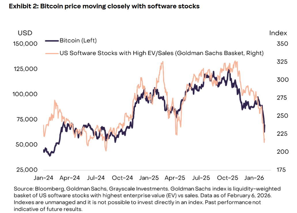 W miarę jak udział instytucjonalny wzrastał, szczególnie poprzez fundusze notowane na giełdzie i inne tradycyjne pojazdy, Bitcoin coraz częściej handlowano synchronicznie z aktywami ryzykownymi. Ostatni spadek akcji oprogramowania, napędzany odnowioną niepewnością co do wpływu AI na sektor, został odzwierciedlony na rynkach kryptowalut, stawiając nowe pytania o ewoluującą tożsamość Bitcoina.