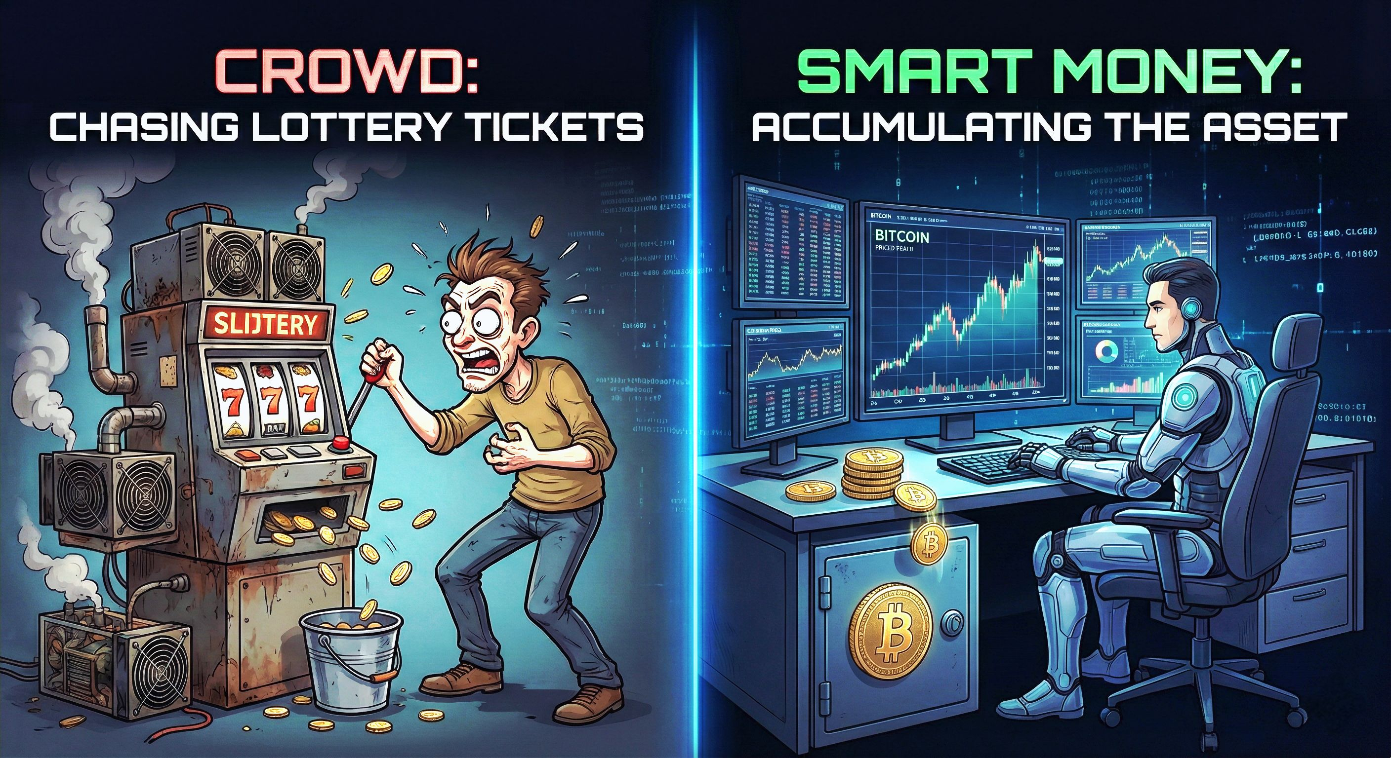 Mądre pieniądze postrzegają to inaczej. Dla dużego kapitału ten przypadek jest jedynie potwierdzeniem fundamentalnej niezawodności sieci Bitcoin. Nie biegną, aby kupować "losy na loterię" w formie starego sprzętu. Nadal gromadzą $BTC samą aktywę w momentach spadków, rozumiejąc, że posiadanie monety jest bardziej opłacalne niż wyścig zbrojeń w hashrate bez dostępu do darmowej energii.
