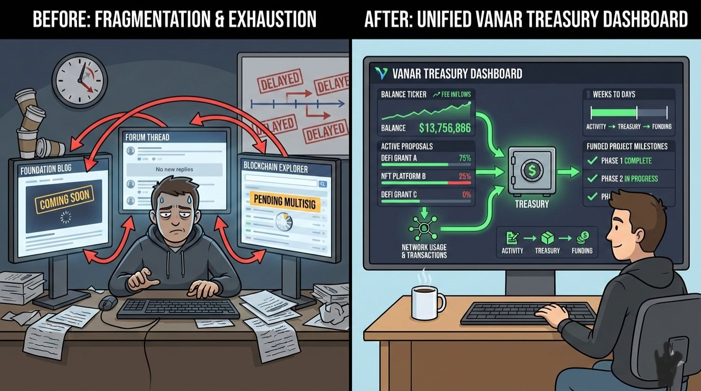That's when Vanar Chain became relevant. It functions like a shared company expense account that everyone can see and vote on, but with receipts enforced on-chain. Instead of waiting for centralized foundation announcements that may or may not match reality, it routes a predictable portion of network activity directly into a community treasury that funds ongoing development. The difference is subtle but operationally meaningful: you don't hunt for updates across five places; you watch one dashboard where inflows from fees and burns feed the pot, and outflows tie to approved proposals.