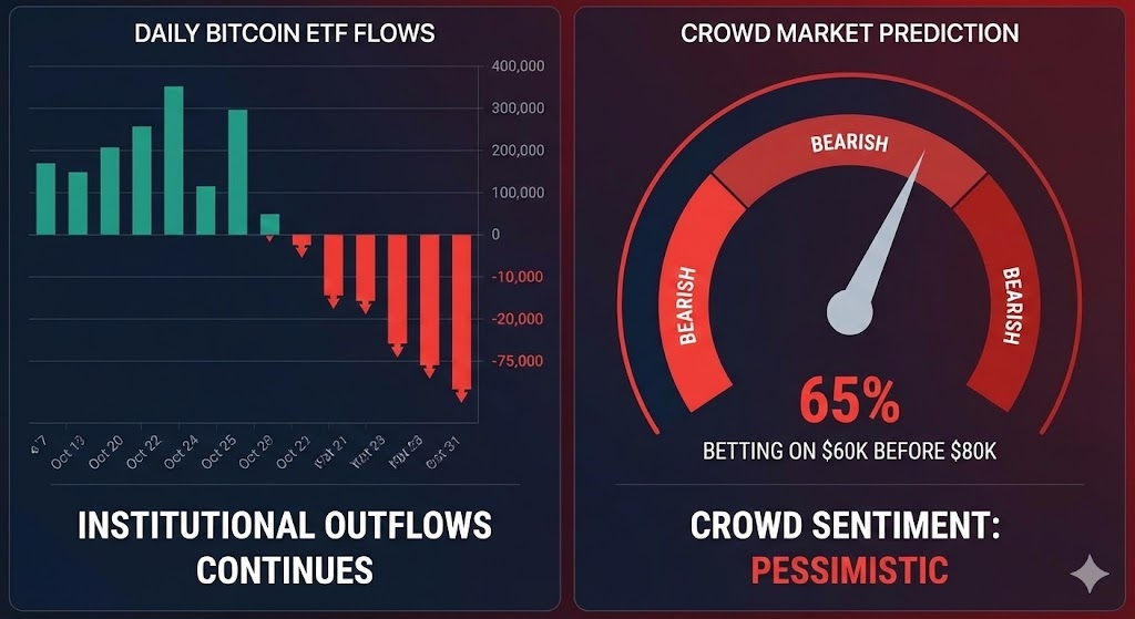 Institutional outflows and bearish crowd expectations highlight growing pessimism.
