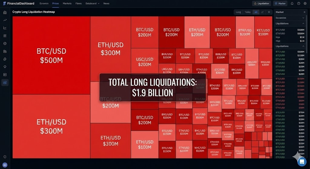Over $1.9B in long positions wiped out, triggering a cascade of forced selling.
