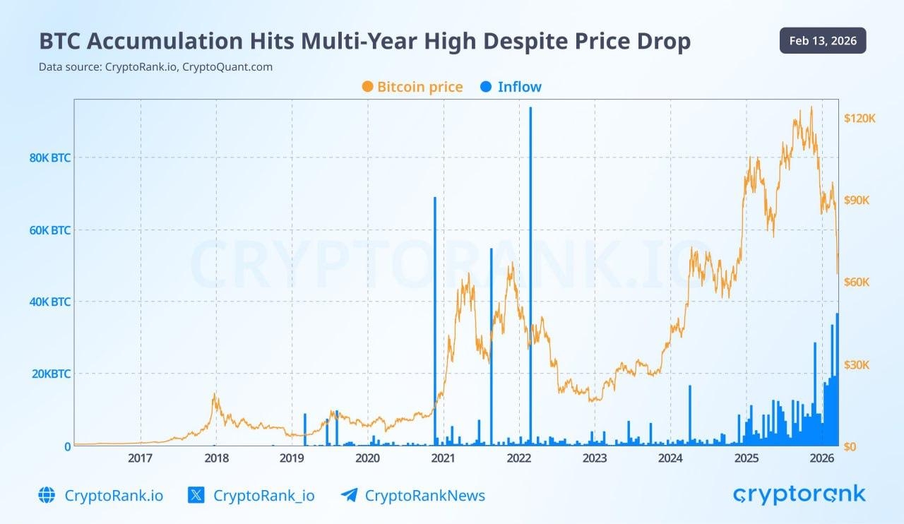 بيانات السلسلة تُظهر أن كبار حاملي البيتكوين يزيدون التجميع مع تراجع السعر، حيث وصلت التحويلات إلى عناوين التجميع لأعلى مستوى منذ أوائل 2022.