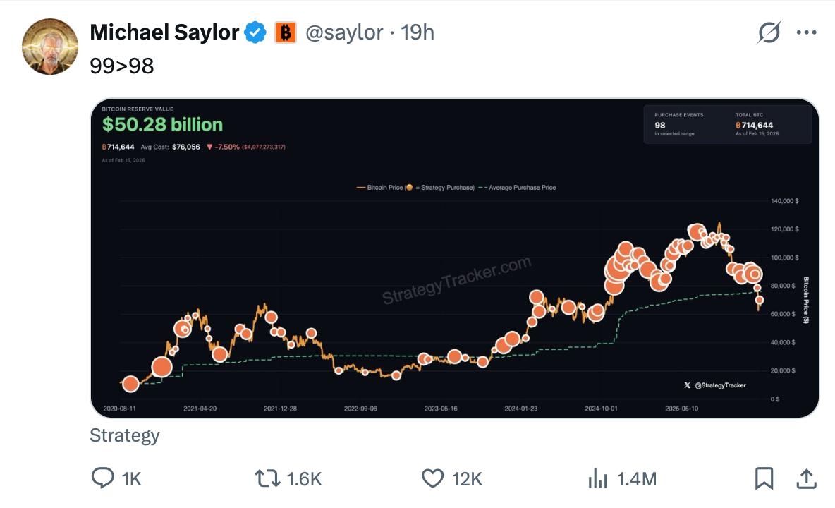 سايلور لمح إلى عملية شراء بيتكوين رقم 99 لشركة Strategy بنشره “99 > 98” مع متتبع المشتريات.