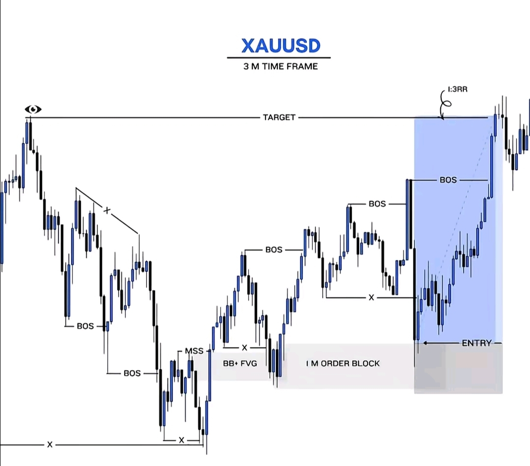 In the 3M chart, price was initially in a bearish structure making lower lows and lower highs. Multiple BOS (Break of Structure) to the downside confirmed continuation of bearish pressure. BOS means price breaks a previous swing low or high confirming trend continuation. This tells us institutions were still in control.