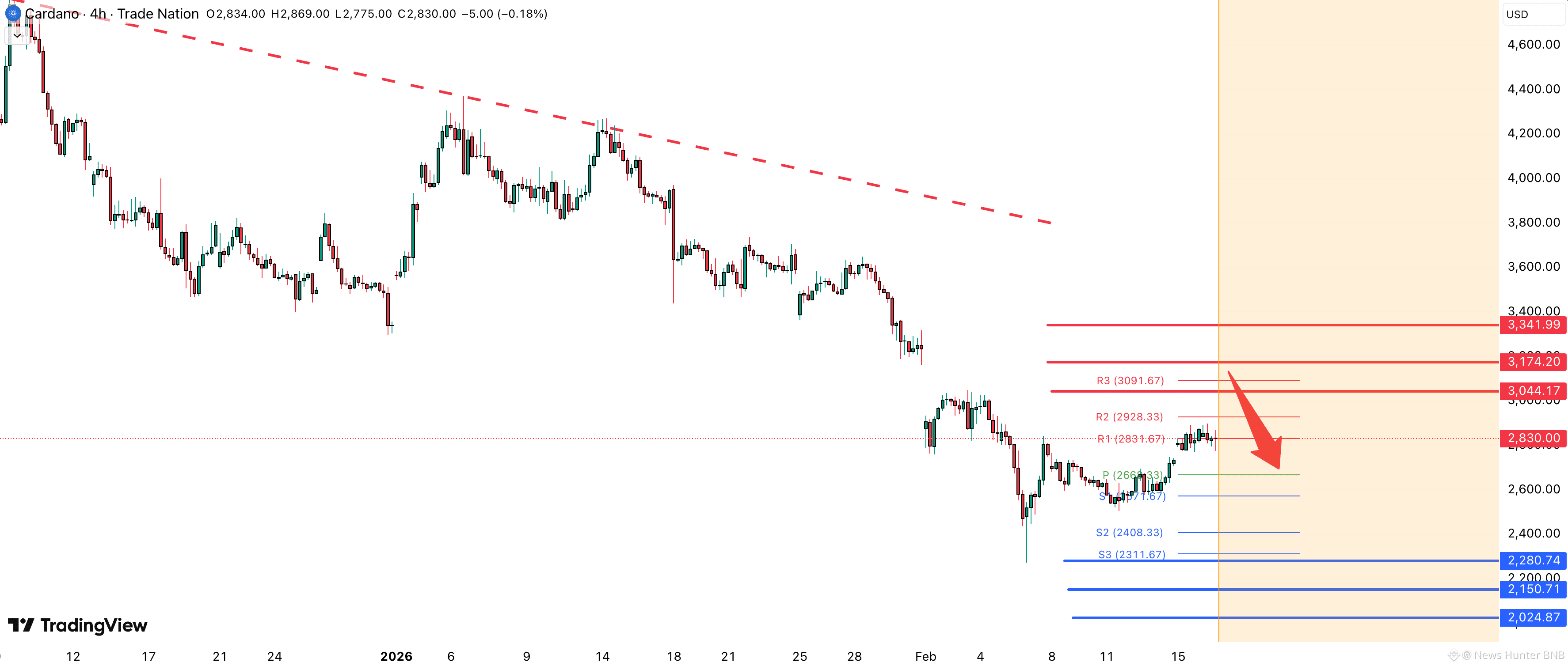 $ADA USD pozostaje pod presją negatywną, z poziomem 3044 działającym jako kluczowy punkt zwrotny. Dopóki cena pozostaje poniżej tego poziomu, nastawienie skłania się ku dalszym spadkom. Traderzy powinni obserwować potwierdzenie ceny wokół tego poziomu, aby ocenić następny ruch.