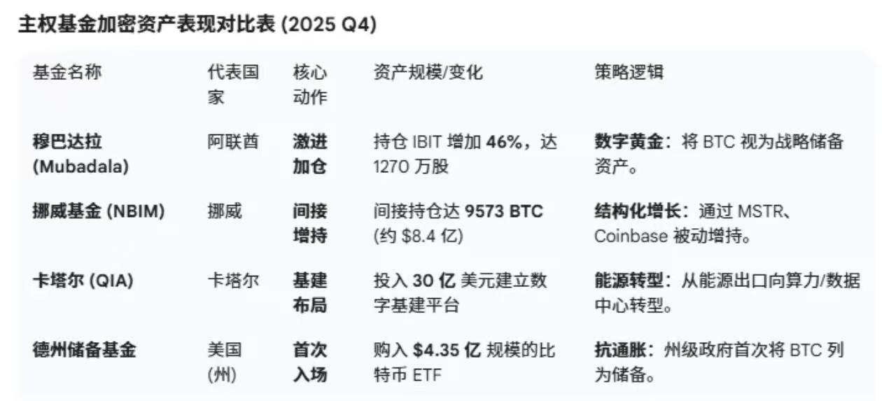 不差钱的阿布扎比穆巴达拉投资公司在Q4大幅增持了比特币,挪威的主权基金则通过持有微策略和矿工股入场加密。