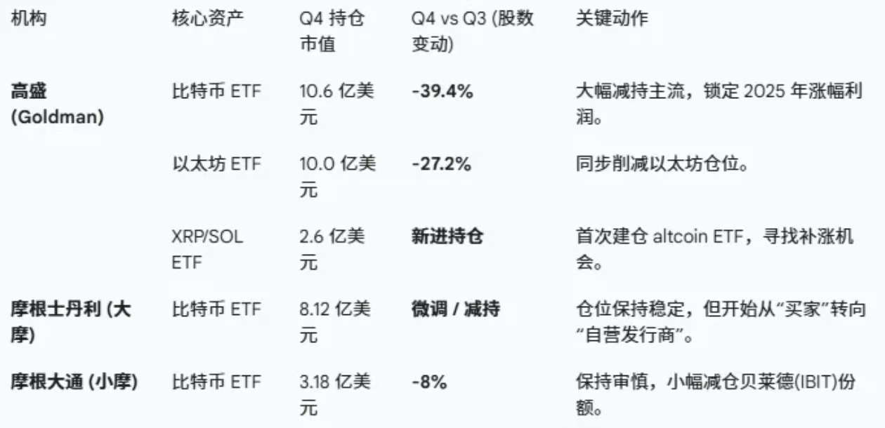 华尔街投行,最具代表性的肯定是高盛和大小摩根。高盛在Q4高位减持了近10亿美金的比特币和以太坊,但是盈利并没有全部跑掉,而是建仓了2.6亿美金的XRP和Solana。相对来说,代表传统金融利益,正在和Coinbase撕逼的摩根则更钻石手一点。大摩的加密仓位基本没变,小摩也仅有8%的减仓。总体来说华尔街投行的主要仓位还是在的,但是没有在高位加仓,还算不错。