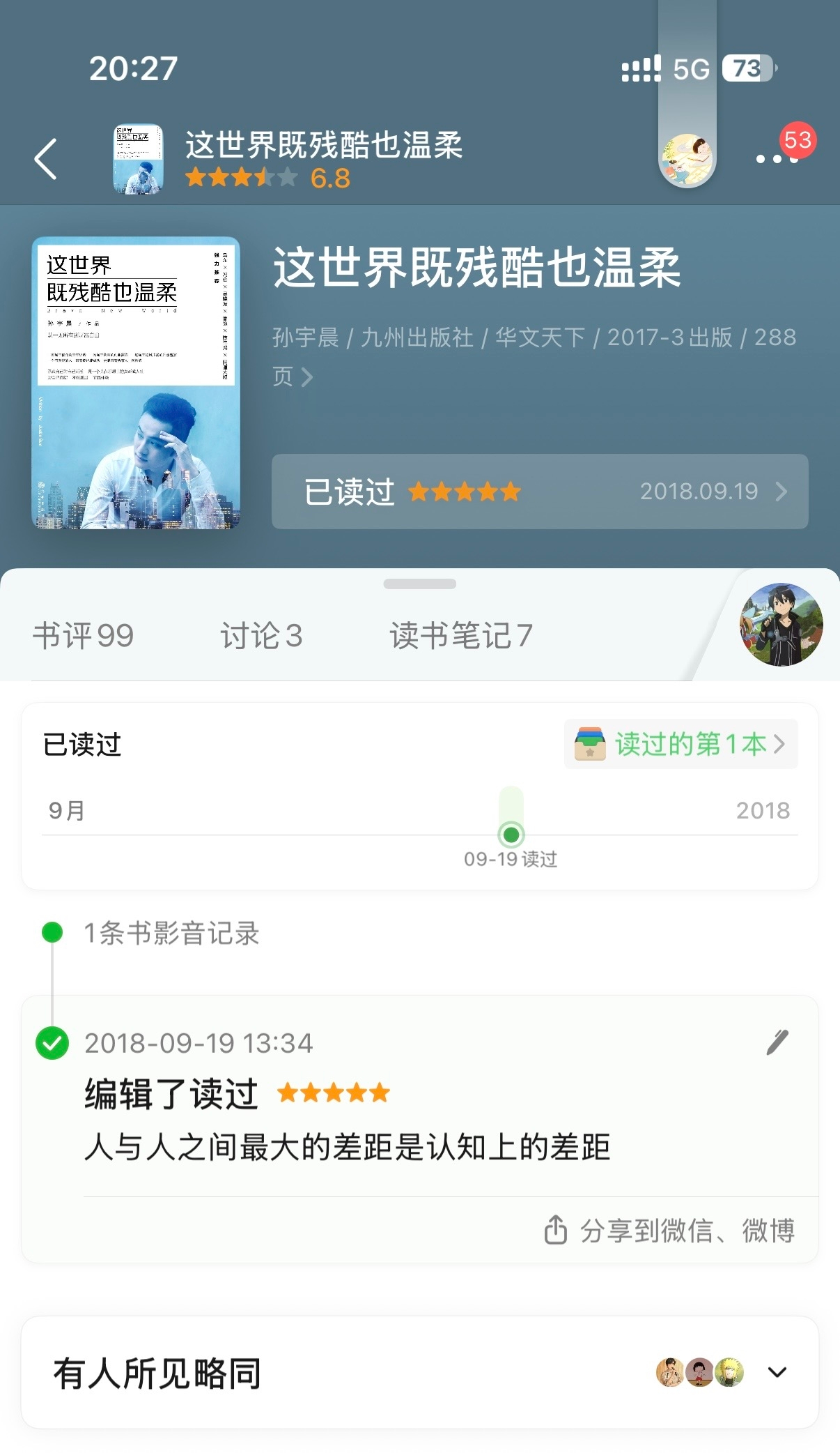 2018 年,我在豆瓣给@Justin Sun孙宇晨 的《这世界既残酷也温柔》打了 5 星。当时的评论只有一句话:“人与人之间最大的差距是认知上的差距。”