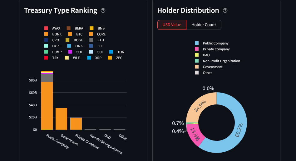 الشركات العامة (Public Company): هي الفئة المهيمنة، حيث تمتلك أصولاً تتجاوز 80 مليار دولار.الحكومات (Government): تأتي في المرتبة الثانية بأصول تقترب من 40 مليار دولار.الشركات الخاصة (Private Company): تمتلك حوالي 20 مليار دولار.فئات أخرى: تشمل المنظمات غير الربحية، والمنظمات اللامركزية (DAOs)، وغيرها، ولكن بمبالغ أقل بكثير.مفاتيح العملات: الألوان في أعلى الرسم توضح توزيع العملات (مثل BTC، ETH، SOL، وغيرها) داخل هذه الخزائن.
