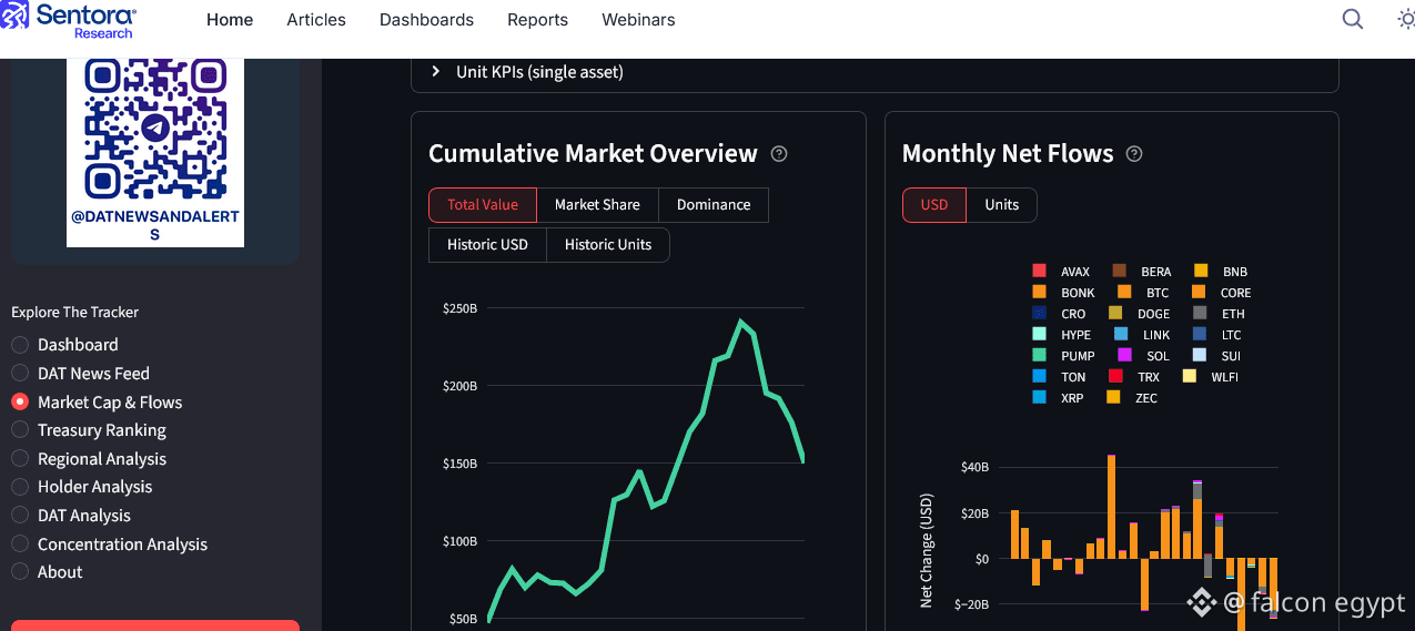 الصورة واجهة من "متتبع خزينة الكريبتو" (Crypto Treasury Tracker) الخاص بمنصة Sentora Research. توفر هذه اللوحة تحليلات حول كيفية احتفاظ المؤسسات الكبرى بالعملات الرقمية كأصول احتياطية.