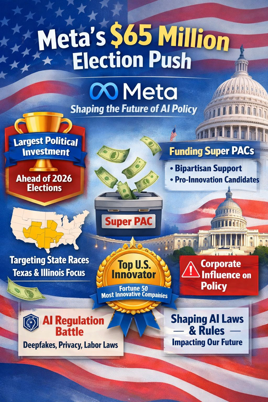In early 2026, Meta $XRP quietly set the stage for one of its biggest political plays yet: a reported $65 million campaign spending push designed to help elect state-level candidates who take a “pro-innovation” stance on artificial intelligence. The effort is expected to start immediately in Texas and Illinois, signaling that Meta’s new priority isn’t Washington gridlock—it’s the faster-moving lawmaking engines in statehouses, where rules on deep fakes, data privacy, AI liability, online child safety, and even data-center construction can advance in weeks, not years.