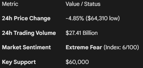 $BTC has plunged below the critical $65,000 psychological support level, hitting a multi-month low as President Trump’s sudden escalation to a 15% global import tariff triggers a massive "risk-off" rotation into gold and safe havens.