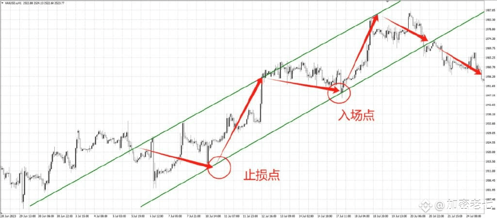 所以,在一个中等上涨中,我们一般在触及通道线下沿的位置入场,并在前一个低点设置止损。