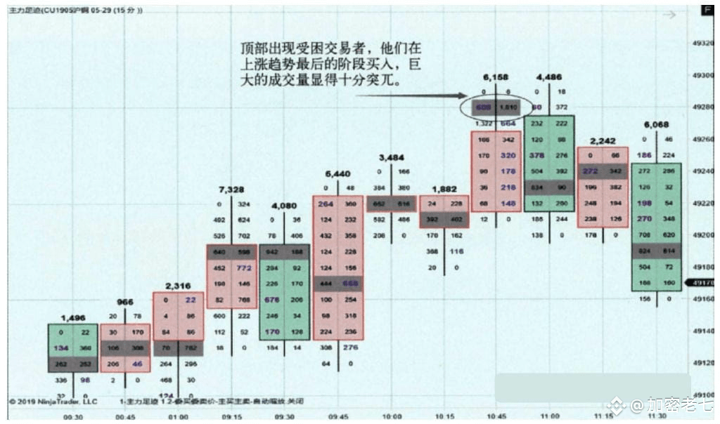 另外,当我们在订单流工具中发现,如果一根在相对高位的K线,其顶部只有多单而没有空单,也通常是见顶的信号,因为我们订单成交机制是一个空单一个多单一一对应,当缺乏空单时,说明空方认为价格无法继续走高,所以不会选择在更高的位置做空。