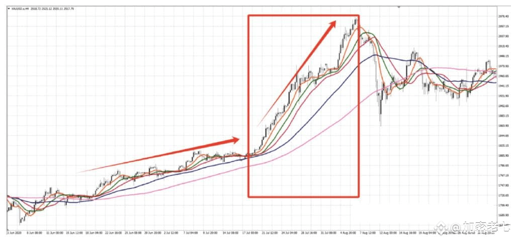 举个最直观的例子,强势上涨中有个非常经典的形态叫多头排列,均线从短周期到长周期,自上而下很均匀的分布,没有出现均线交叉。