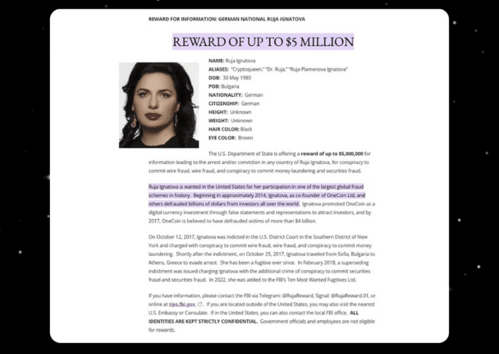 Ruja Ignatova, "Cryptoqueen", ukradła ponad 15 miliardów dolarów za pomocą swojej fałszywej kryptowaluty, OneCoin, zanim zniknęła w 2017 roku.