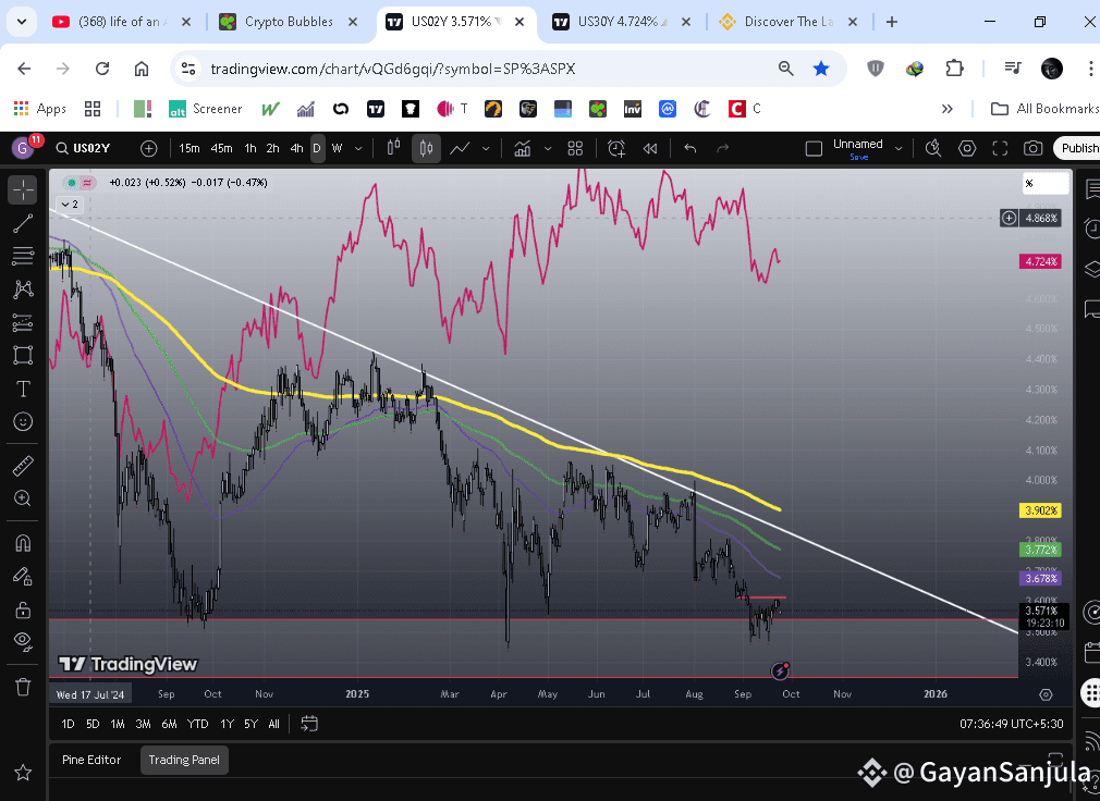 The U.S. Treasury market is one of the most important indicators for global finance. Two of the most watched benchmarks are the 2-Year Treasury Note yield (UST2Y) and the 30-Year Treasury Bond yield (UST30Y). When these two yields move in opposite directions — the 2-year going up while the 30-year goes down — it sends a powerful signal about the economy and risk assets, including cryptocurrency.