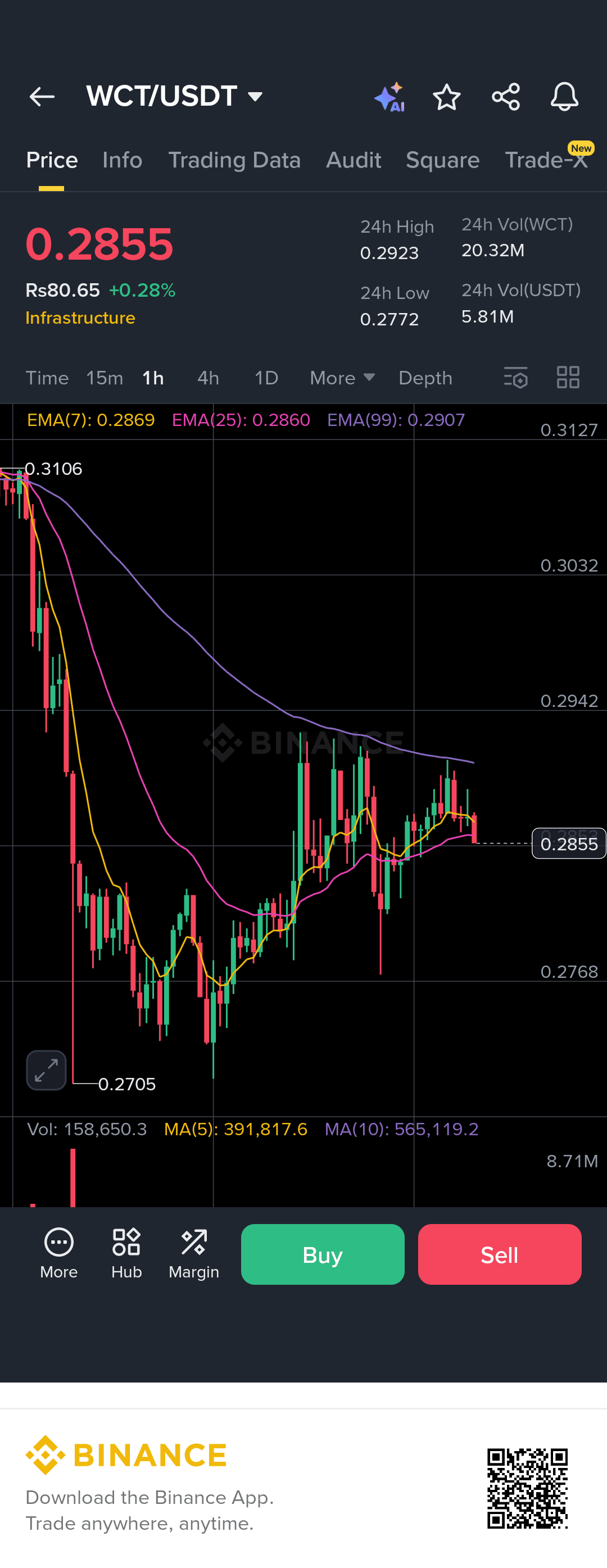 HODLers, słuchajcie! 💁♂️ WCT/USDT obecnie handluje po 0.2855 USDT z niewielkim wzrostem o +0.28%. Patrząc na wykres 📊, widzimy, że WCT utrzymuje się powyżej kluczowych poziomów wsparcia po spadku. Linie EMA (7, 25, 99) pokazują konsolidację 🔩, a wolumen 📈 jest przyzwoity, z 20.32M WCT handlowanych w ciągu 24h.