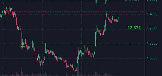 Po handlu przy cenie 5.5 USDT była reakcja sprzedawców i próba wejścia w transakcję zakończyła się sukcesem. Zabrałem 12,5% czystego ruchu przy dźwigni x15 dało zysk.